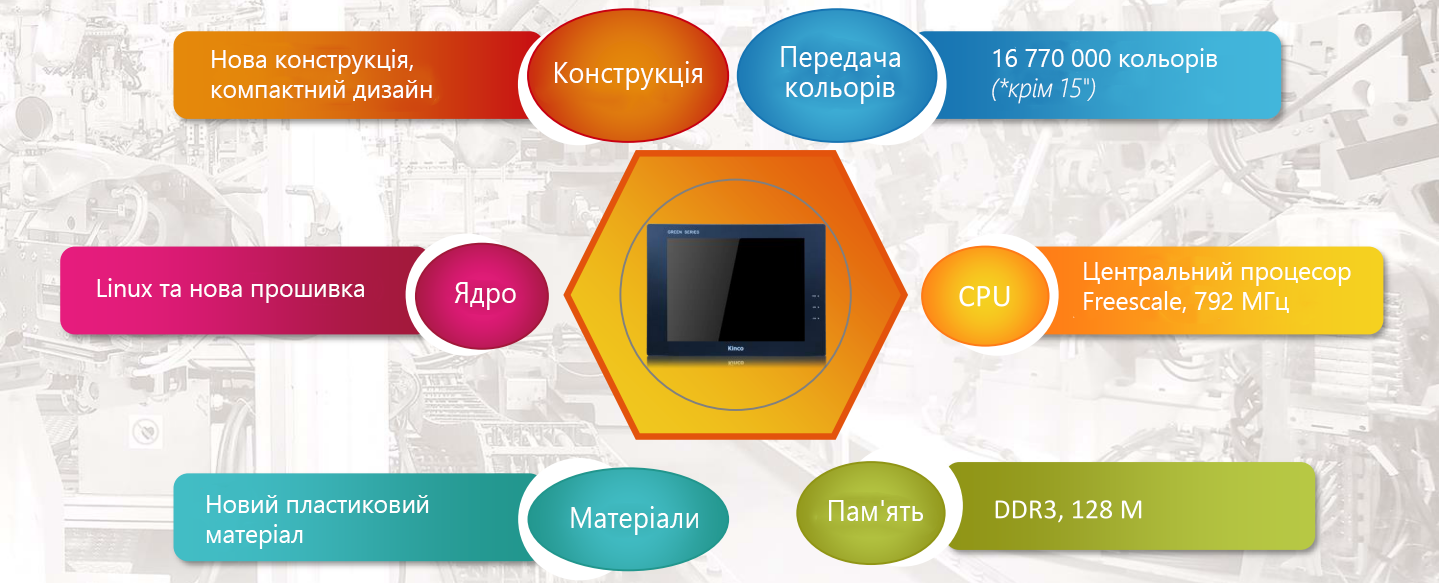 Всі панелі серії Green виконані в оновленому дизайні з ядром Linux і новою прошивкою, центральним процесором Freescale, 792 МГц, пам'яттю DDR3, 128 M, і найголовніше, що тепер панелі мають перенесення кольору в 16 770 000 кольорів (* окрім 15')! Більше важливою деталлю є захисне покриття друкованої плати, яке дозволяє підвищити міцність, вологостійкість, пилозахищеність, а також попередити корозію плати в будь-яких, навіть найнесприятливіших умовах експлуатації (температурний експлуатаційний діапазон від -10 до +55ᵒС).