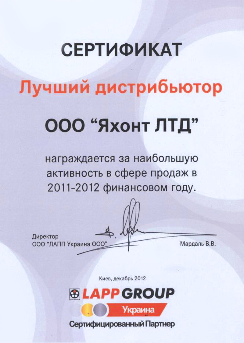 Компанія ЯХОНТ - найкращий дистрибютор Lapp Kabel у 2012 році на території України.